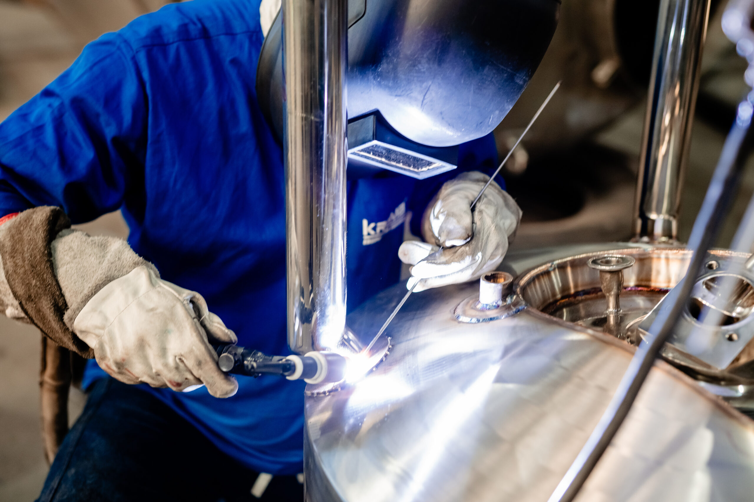 Cada etapa, do corte de chapa à montagem final, é documentada. A soldagem, ponto crítico em equipamentos que operam com pressão, vácuo ou produtos de alta criticidade, é conduzida por profissionais qualificados e registrada em detalhe.